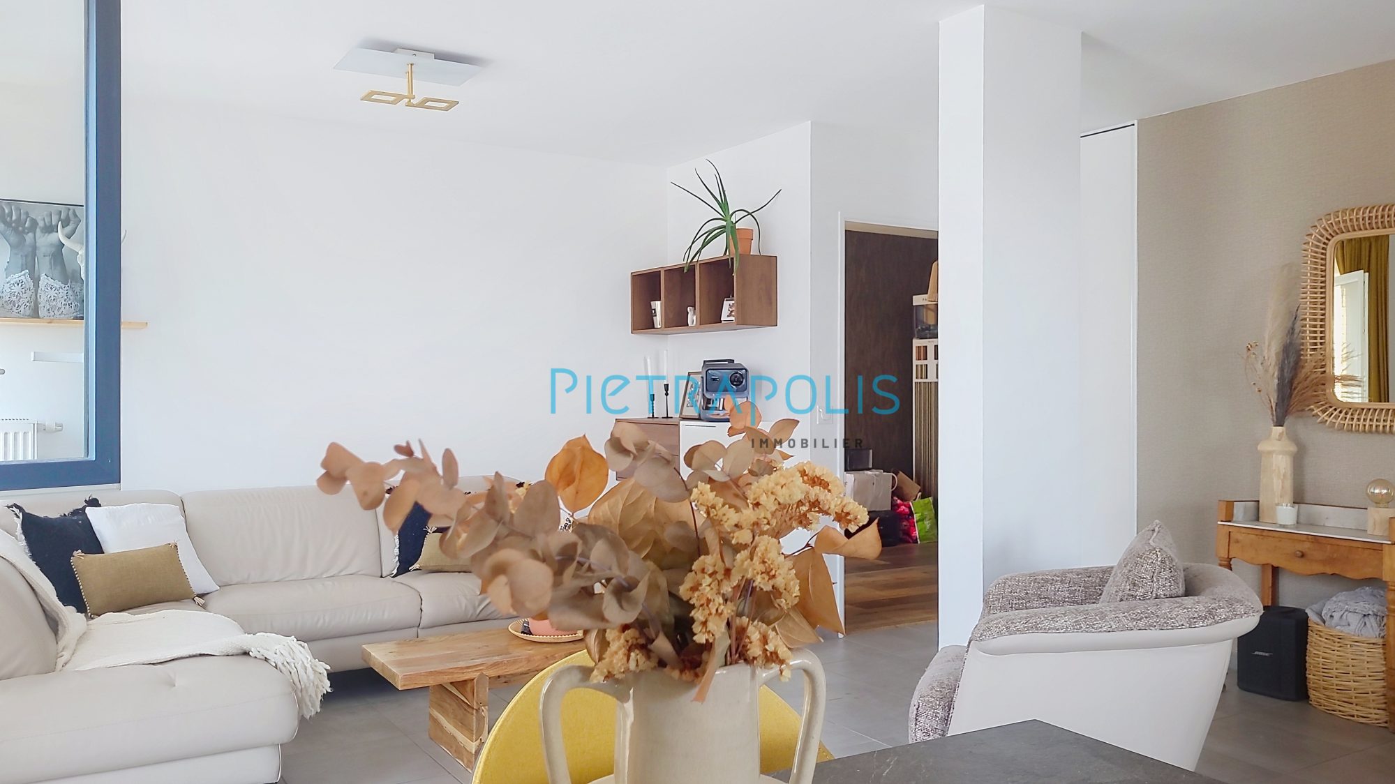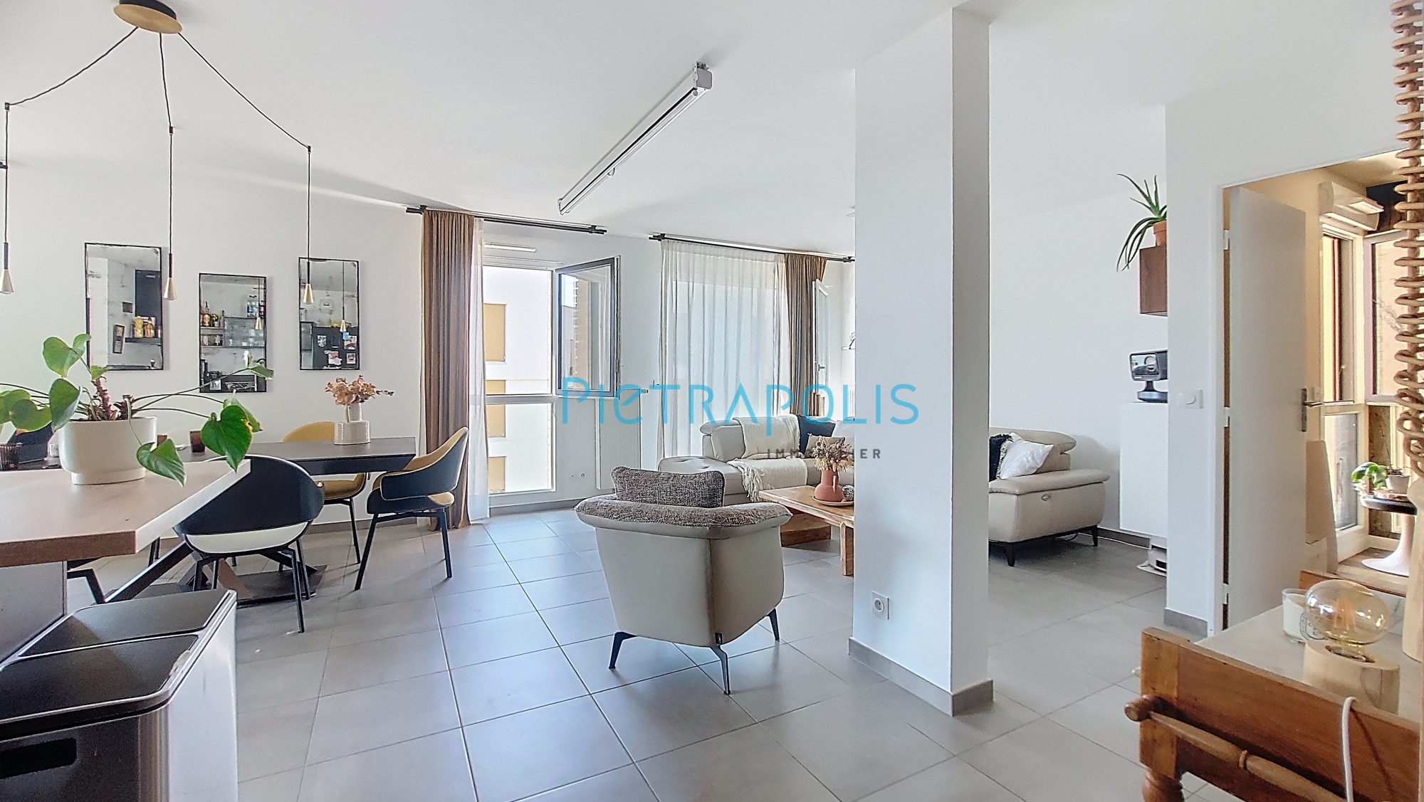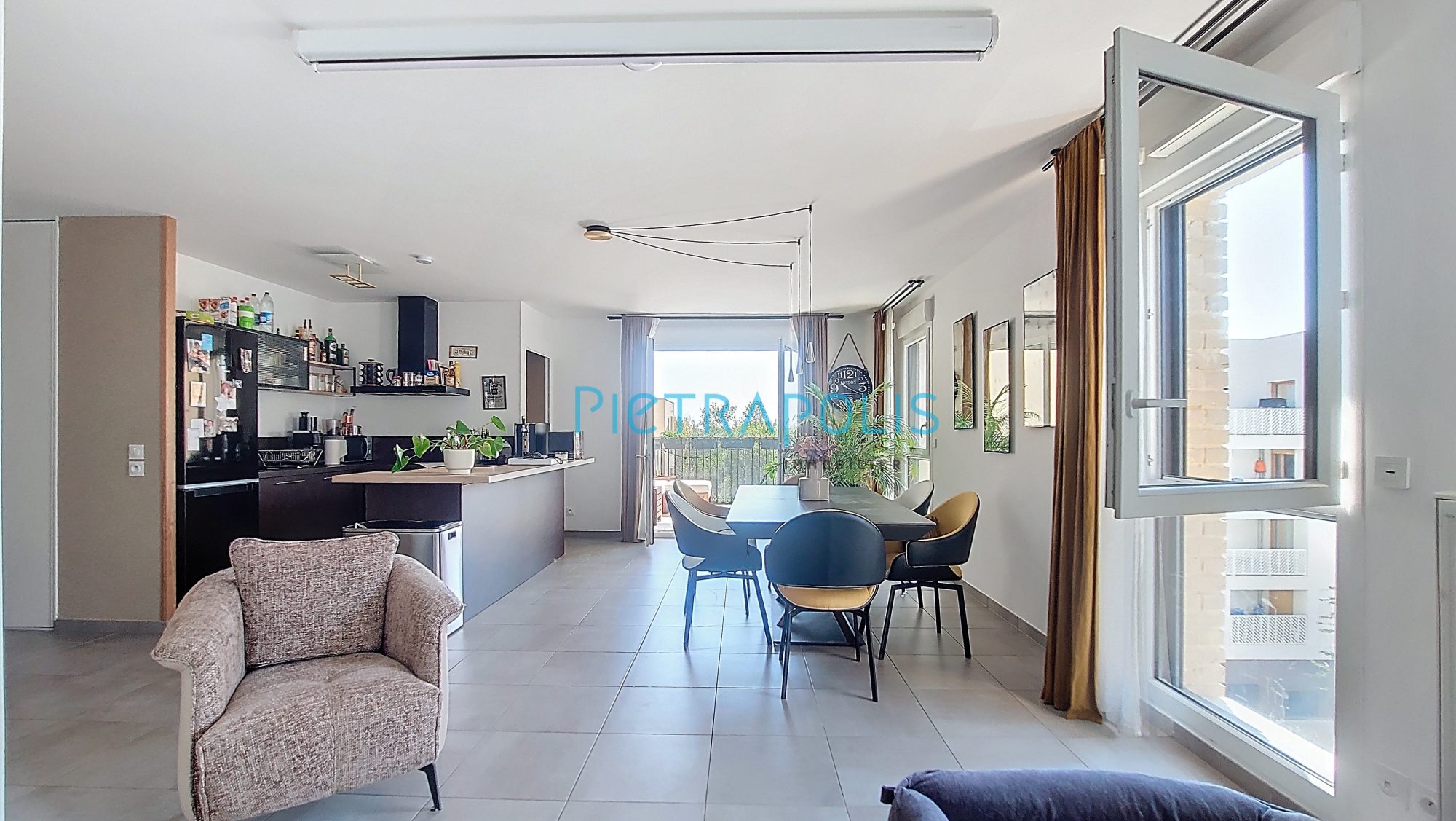 L'appartement s'ouvre sur un séjour lumineux de 42 m², baigné par la lumière grâce à ses ouvertures PVC/Aluminium à double vitrage, offrant une vue dégagée Est-Ouest.