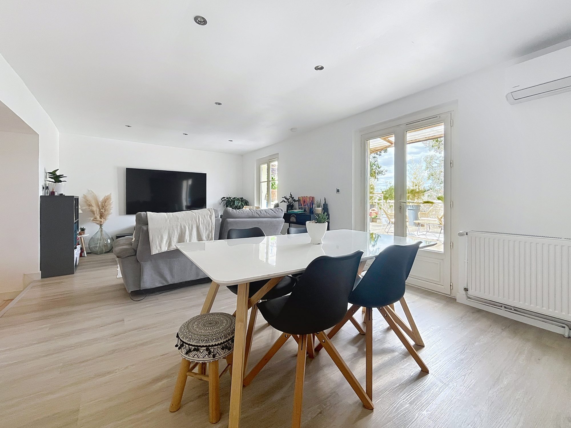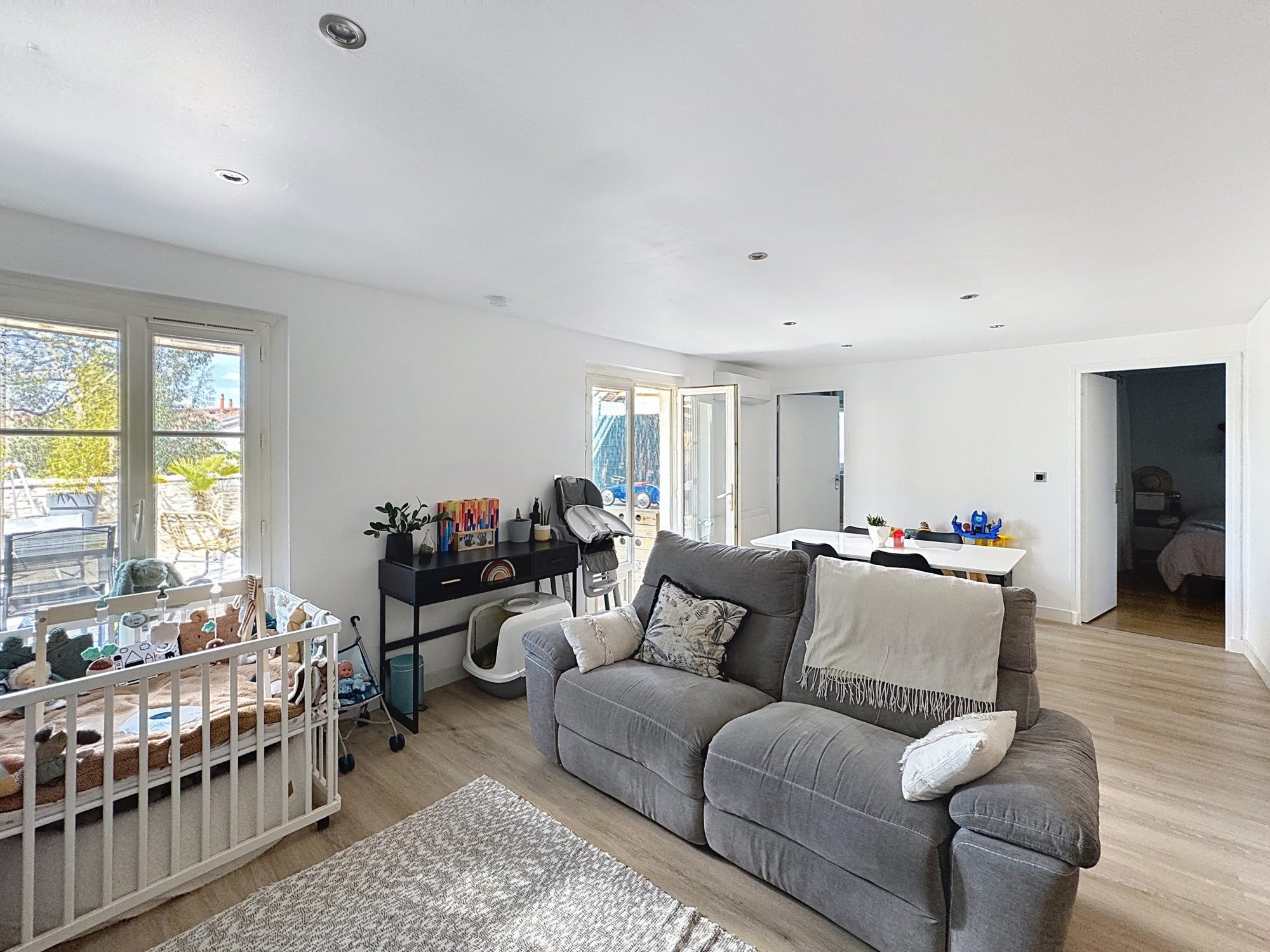 La pièce de vie et son sol parquet de 37 m2 se compose d'une cuisine ouverte sur salon avec accès direct sur une belle terrasse aménagée de 44 m2, ainsi qu'un wc indépendant.