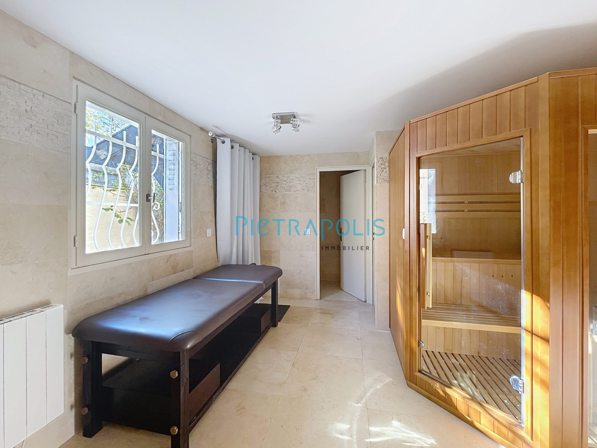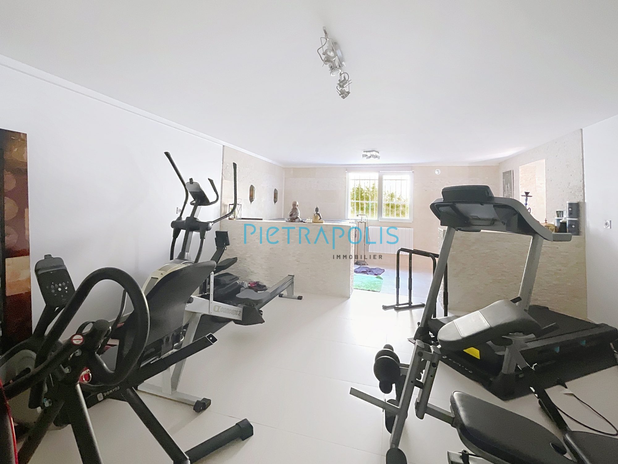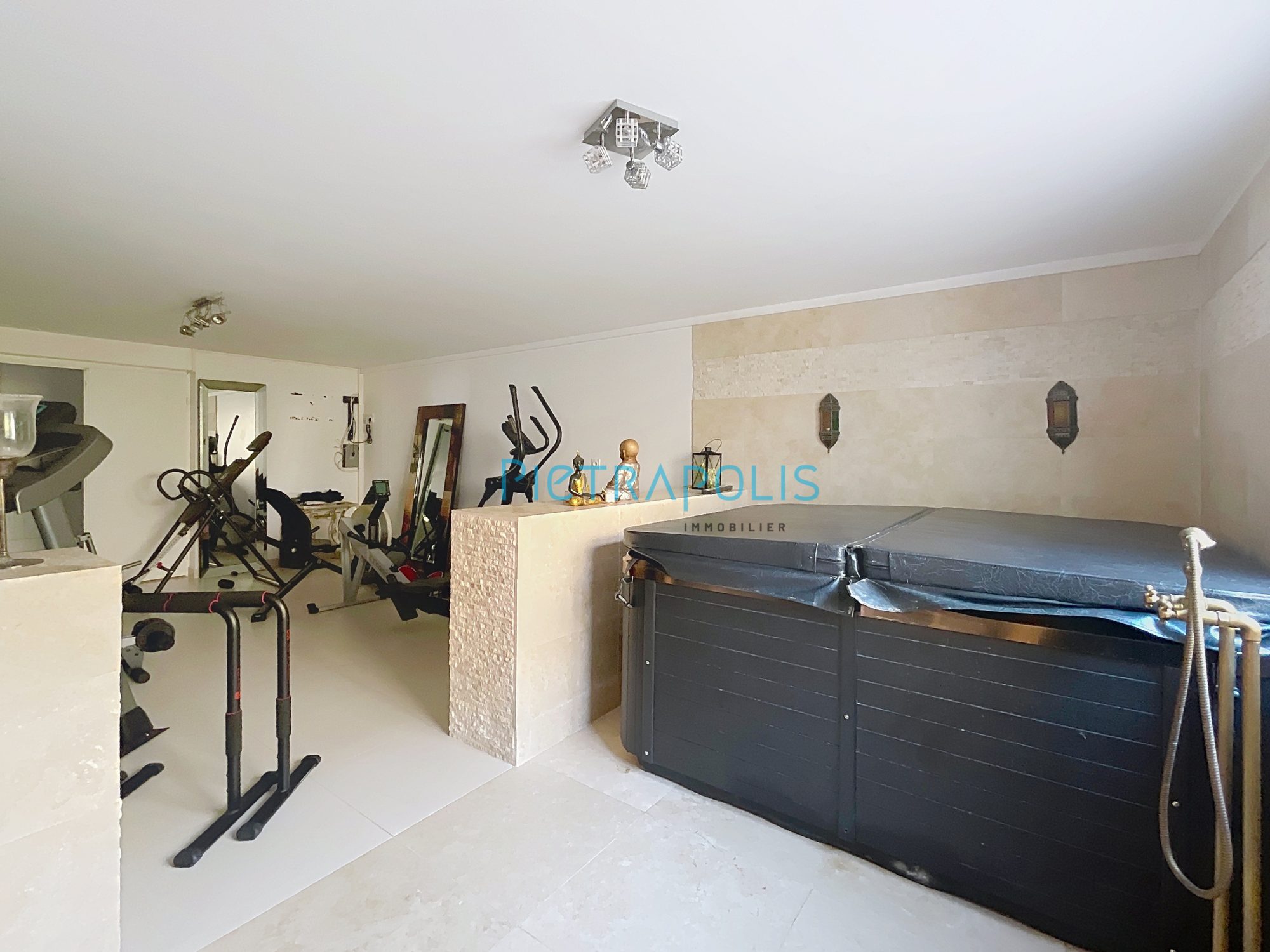 en sous sol un garage double, un atelier, une salle de sport entièrement équipée avec jacuzzi et sauna, une chambre un coin cuisine, espace idéal pour chambre d'hôtes ou loger un adolescent en quête d'indépendance.