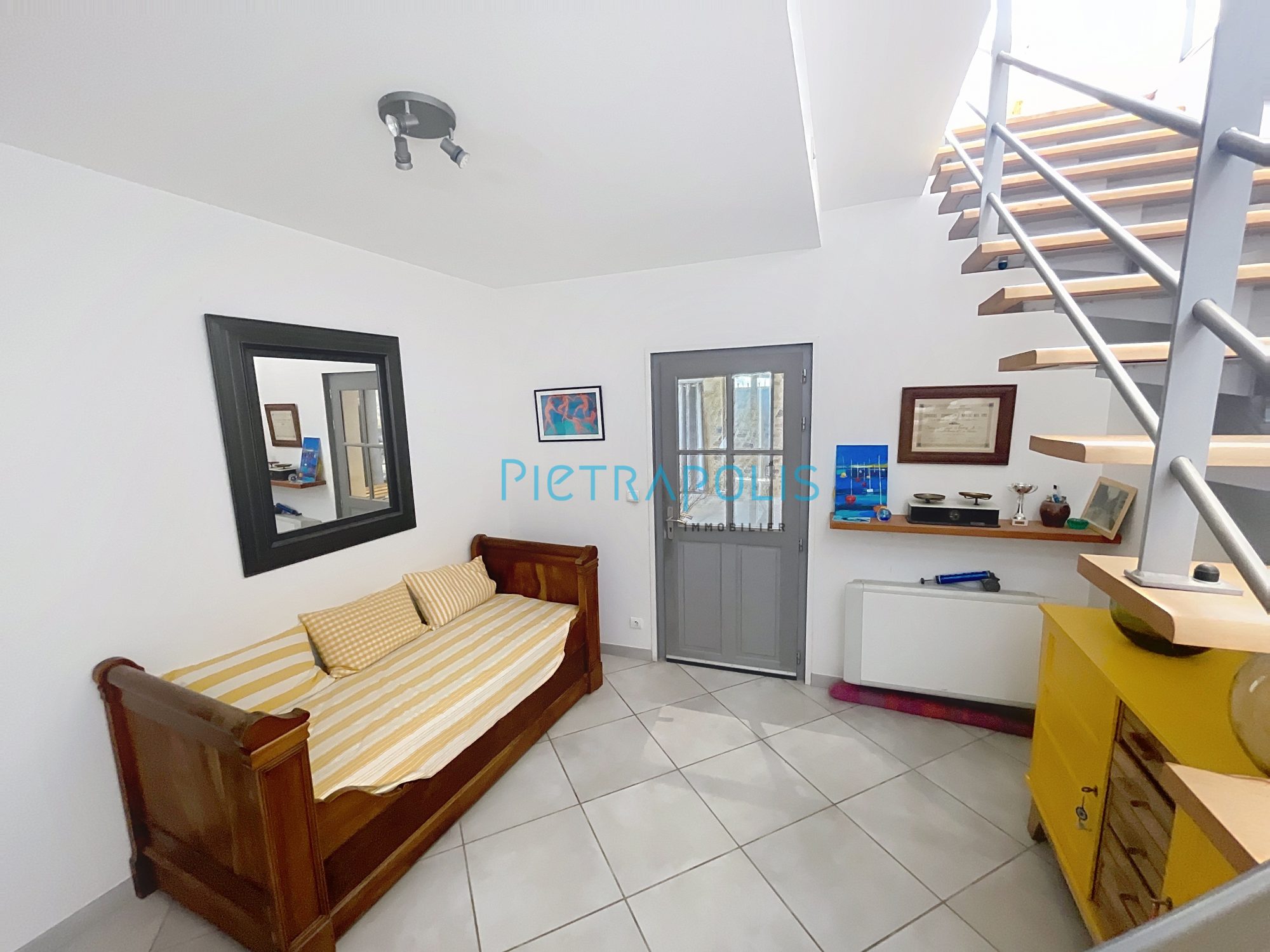 Le rez de chaussée permet l'accès par un bel escalier sur l'espace de vie ou se logent entrée verrière, un coin détente, une chambre et salle d'eau wc.