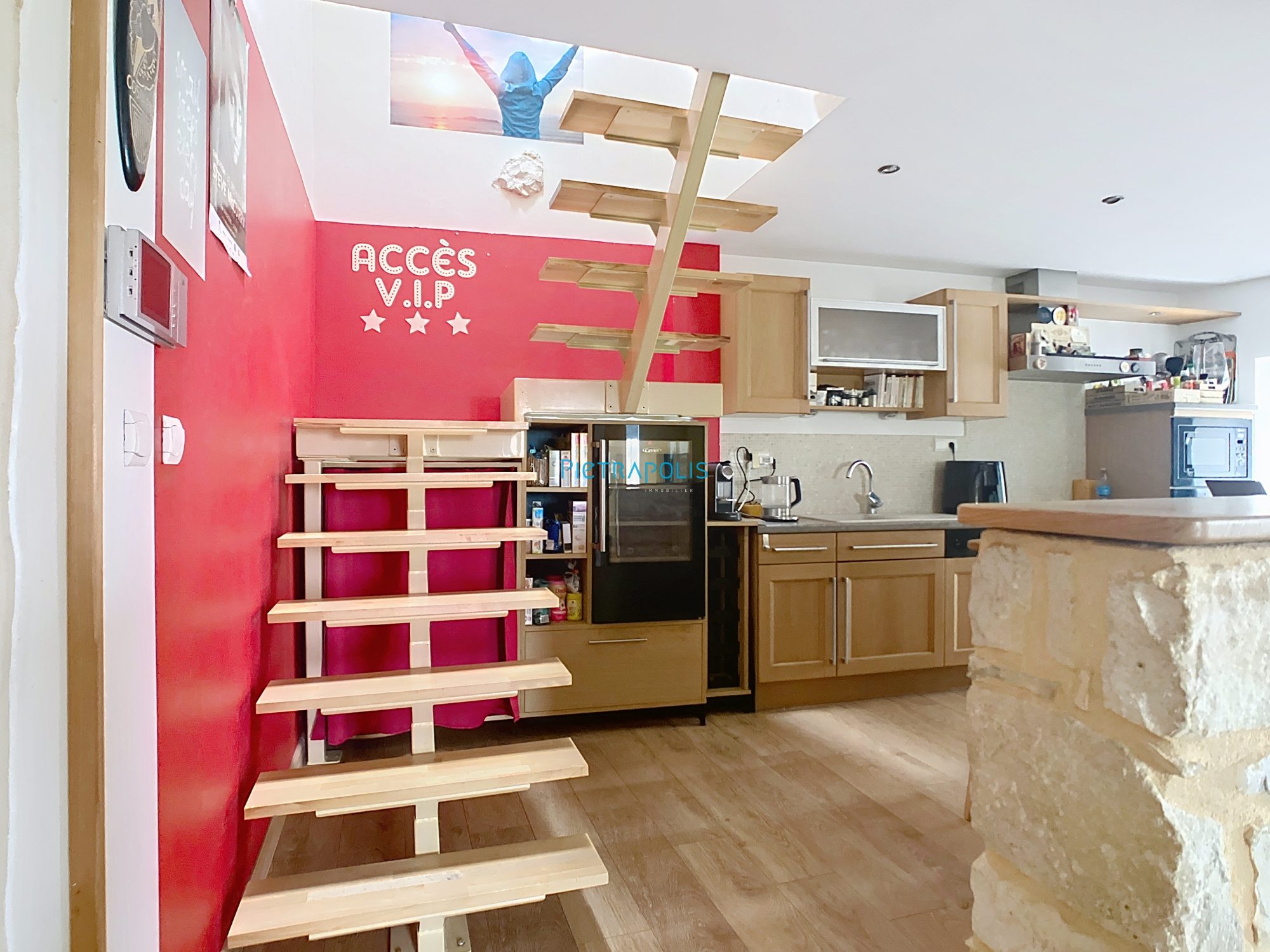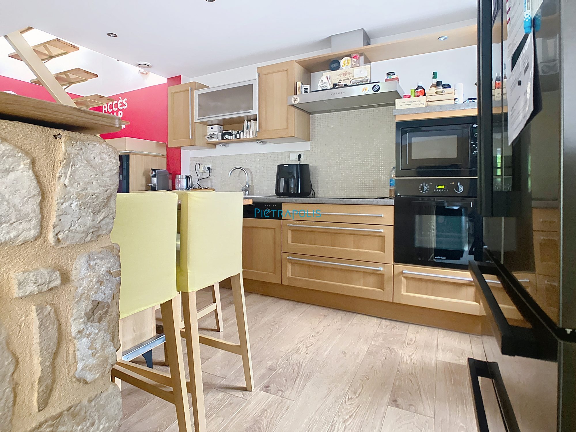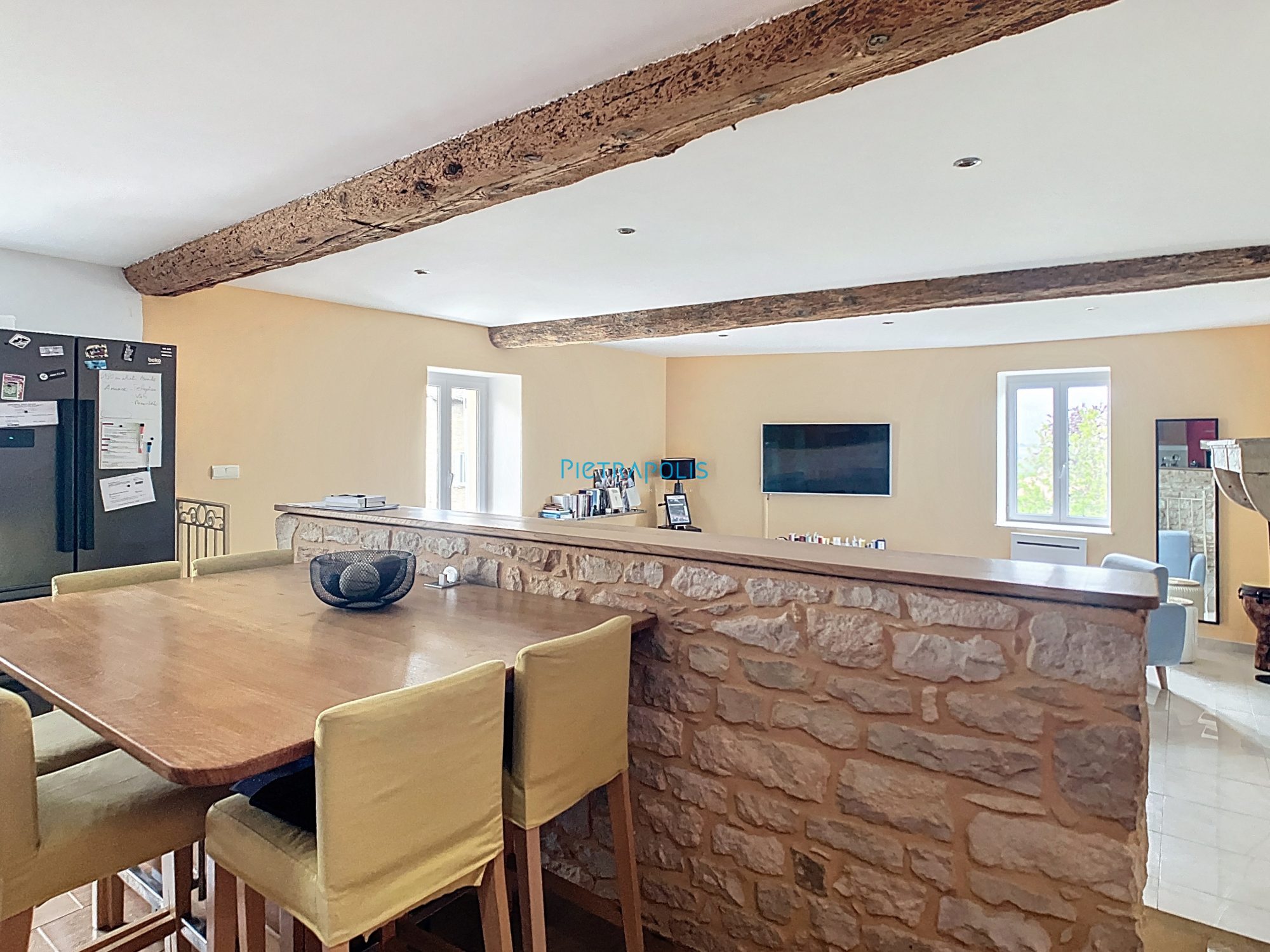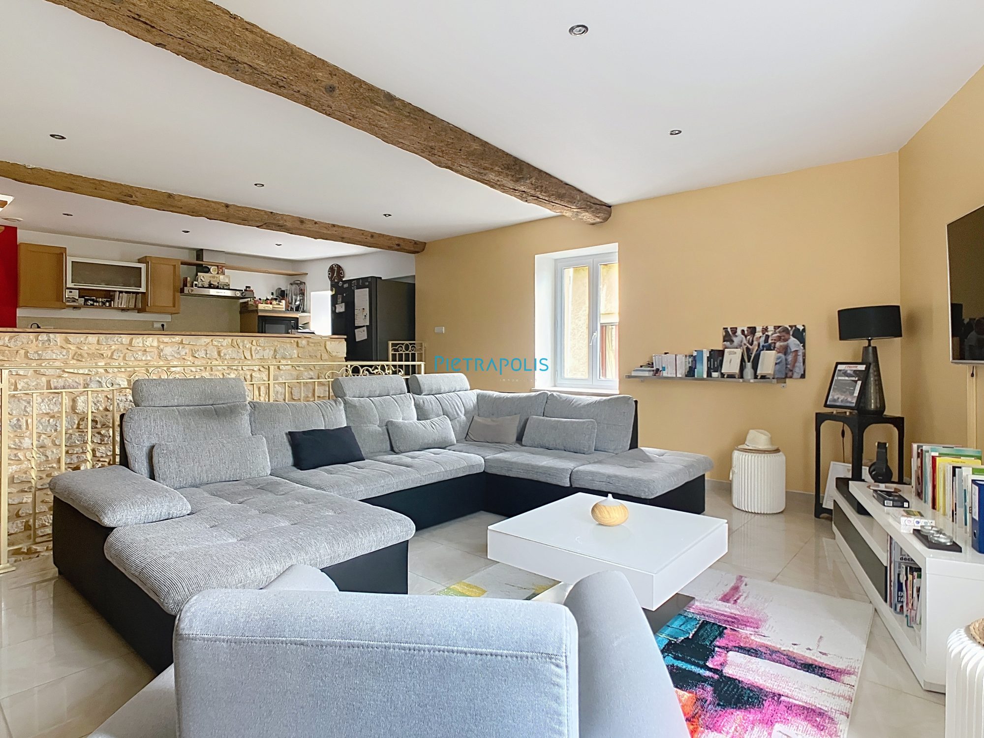 Grande pièce de vie lumineuse et sans vis à vis qui propose une cuisine avec son espace dinatoire et un salon avec une cheminée décorative en pierres.