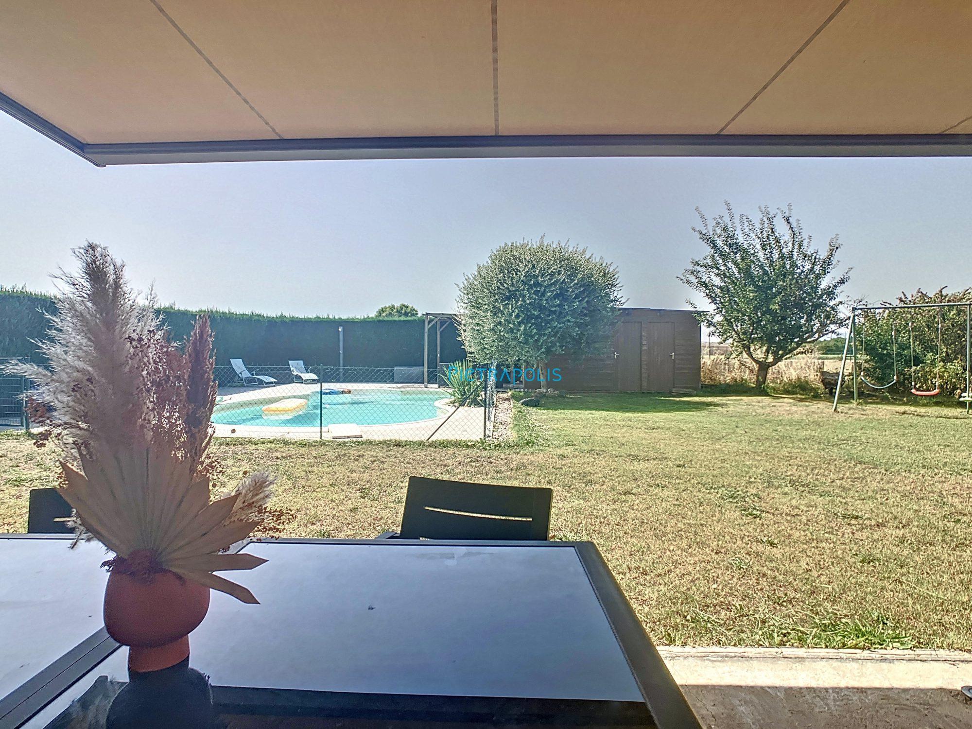 La terrasse de la maison dispose d'un grand store d'ombrage.