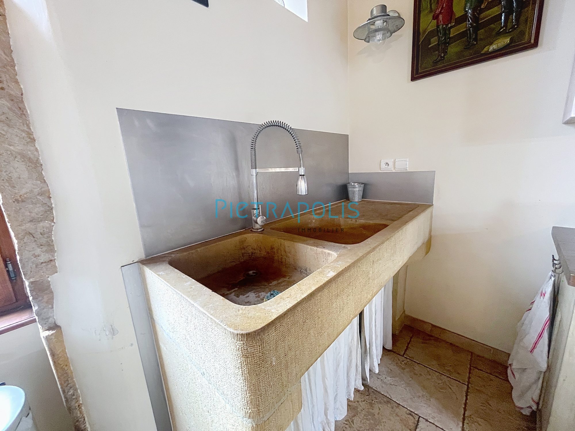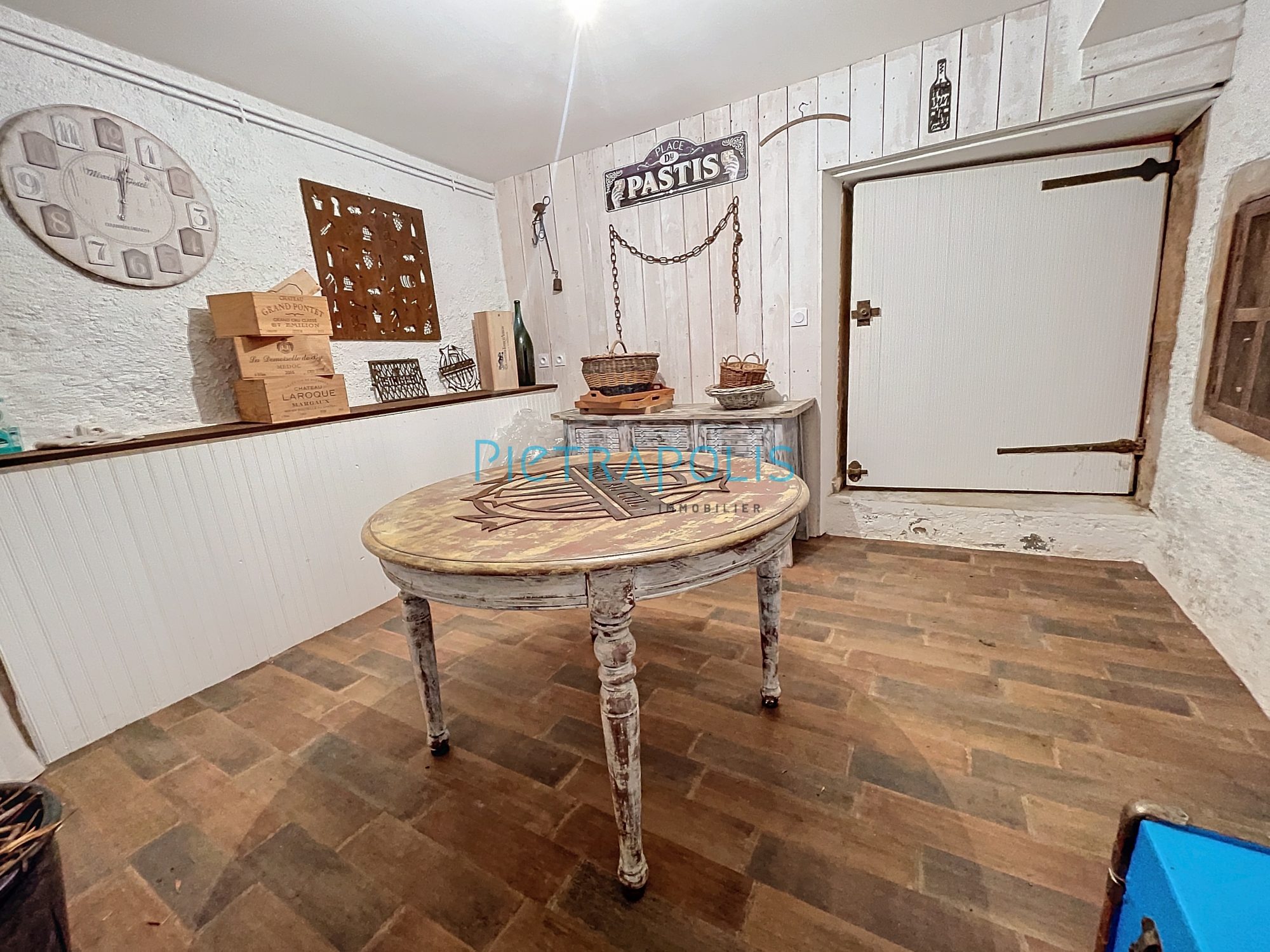 côté Sud, une autre cour close de murs vous emmène sur la partie cave qui comprend, le coin chaufferie/buanderie, un espace aménagé en salle de sport, puis une cuisine d'été qui communique directement sur le jardin et une cave atypique pour déguster les bonnes bouteilles entre amis.