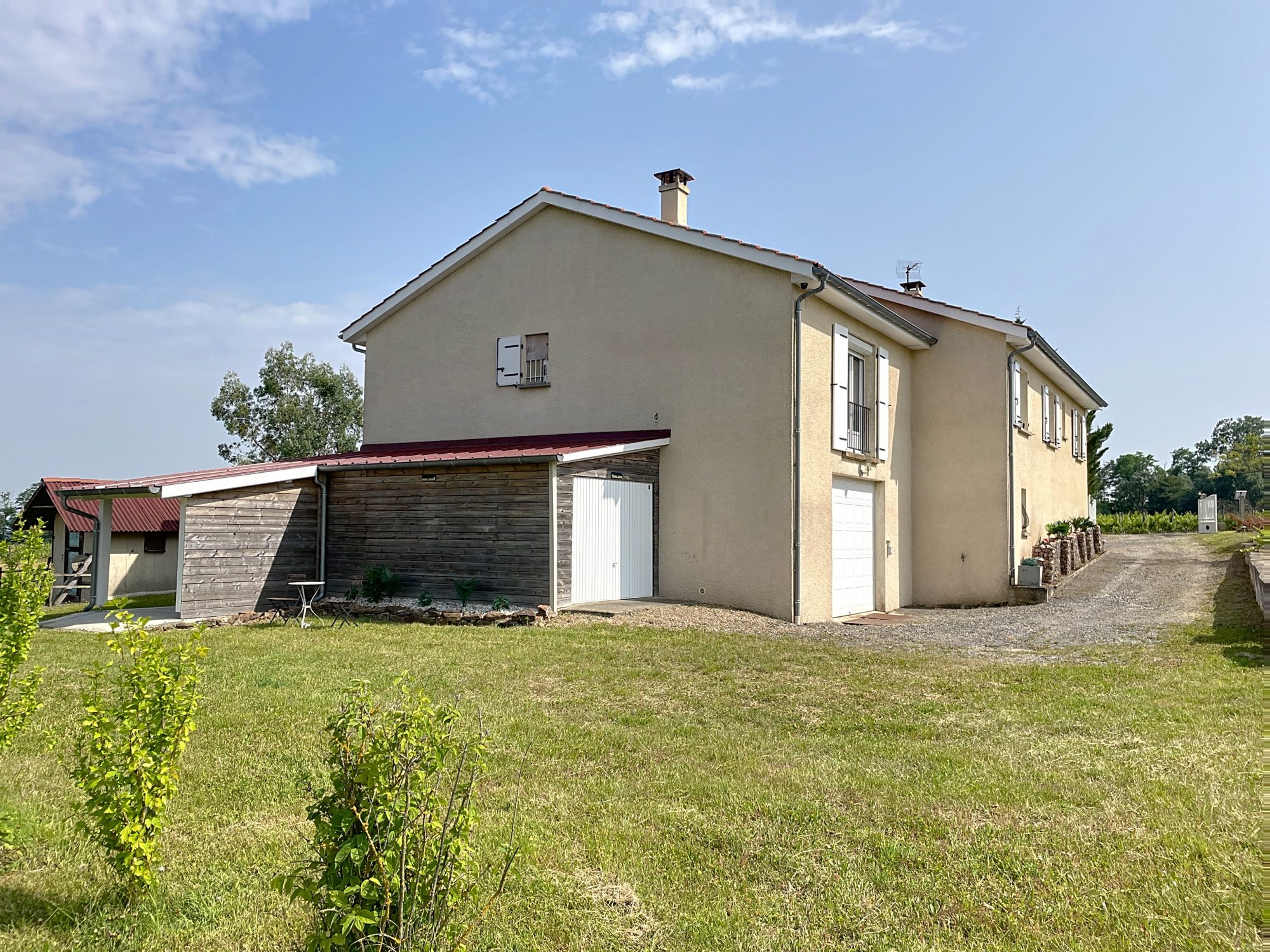 CHENAS (5 minutes de la gare de Romanèche) - maison 200 m² hab env. - 7 pièces - 5 chambres - 2 salle d'eau - 1 salle de bains - 3 garages dont un double - abri de jardin - Préau - 2 terrasses - Exposition Est-Ouest - vue panoramique sur les Monts du beaujolais.