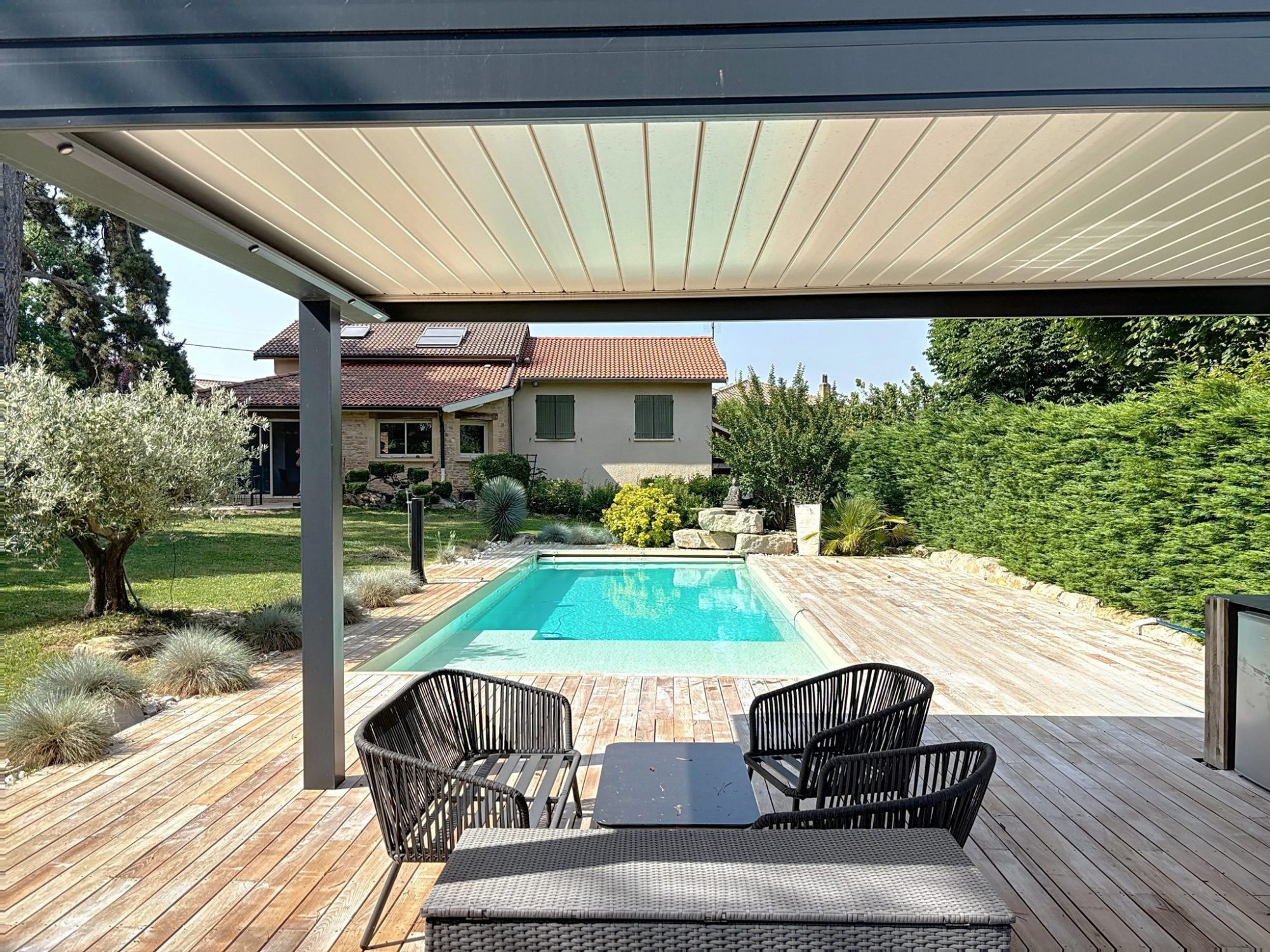 Attention, nous sommes là sur un bien avec un haut niveau de prestations : cuisine Bernollin ouverte avec vue imprenable sur le jardin, salon équipé d'une cheminé design Polyflam, cuisine d'été avec pergola bio climatique aux abords de la piscine de 11,5x3, sans parler de la salle de cinéma digne des plus grands complexes!